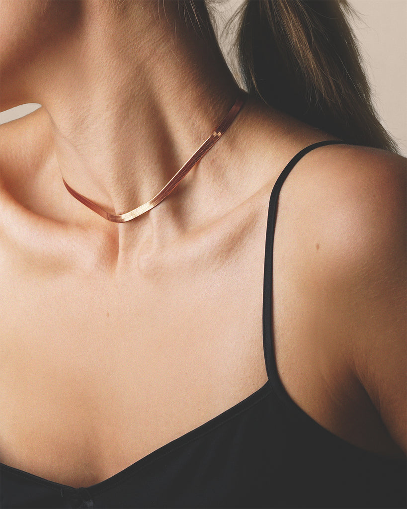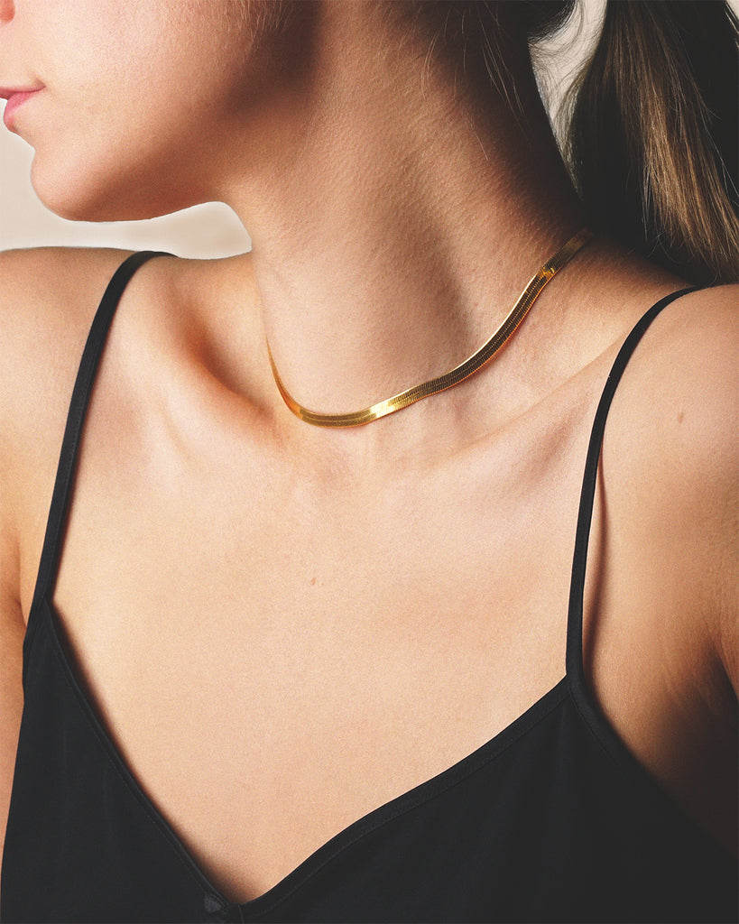The quintessential statement piece: Flat Serpent Chain. This classic yet sleek necklace effortlessly drapes around your neck.